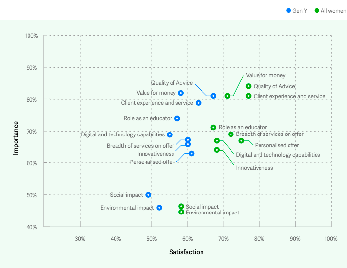 Broadly, advisers are meeting the needs of female clients, with around seven in ten who receive advice today indicating they are satisfied with many aspects of the offer, including value for many, quality of advice, client experience, breadth and personalisation of service.   Gen Y women are less impressed, although still largely satisfied.