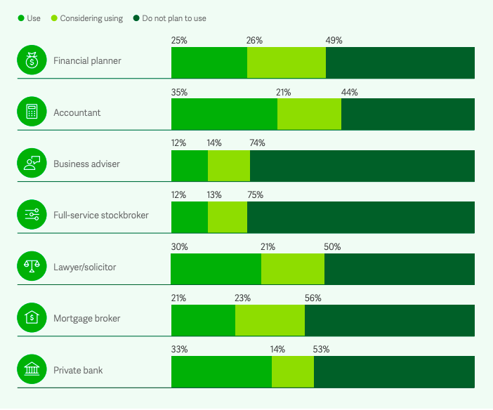 According to the 681 women Netwealth surveyed for the Women as the New Face of Wealth report, 25 per cent of women use a financial planner, which is slightly less than other mainstream service providers such as accountants (35 per cent use), private banks (33 per cent), and lawyers (30 per cent).