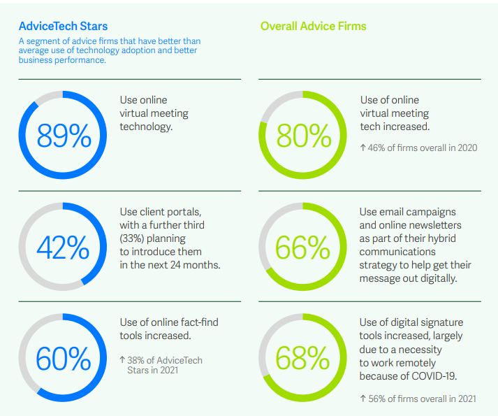 Encouragingly, advice firms are doing well on the digital adoption front – according to Netwealth’s 2022 Advice Tech Report, 80 per cent of firms hold meetings online, 66 per cent use email newsletters in communications, and 68 per cent use digital signature tools to remove friction.