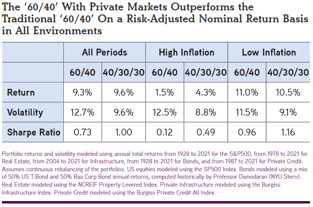 - Enhancing the ‘60%‘ Capital Appreciation Component by reducing the allocation to public stocks to 40%, while adding 10% to Private Infrastructure and 10% to Private Real Estate.