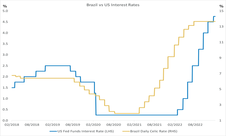 Some of the more vulnerable economies were impacted earlier and more severely by the COVID-19 pandemic, which required a faster and more aggressive reaction. Latin-American economies, such as Brazil, hiked interest rates 12 consecutive times between February ’21 and September ’22, with the market now expecting the first rate cut in November ’23.  Inflation and unemployment are also past peak levels, supporting consumer and business confidence.