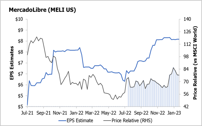MELI is a high-quality company with strong earnings growth, which we view as attractively valued at 40x FY24 price/earnings.