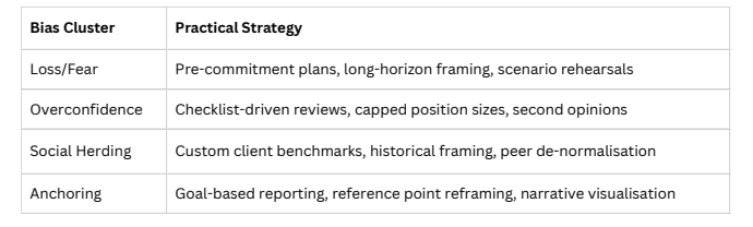To counter these biases, advisers need more than technical skill — they need process, structure, and client alignment. Below is a summary of practical strategies mapped to each bias cluster.