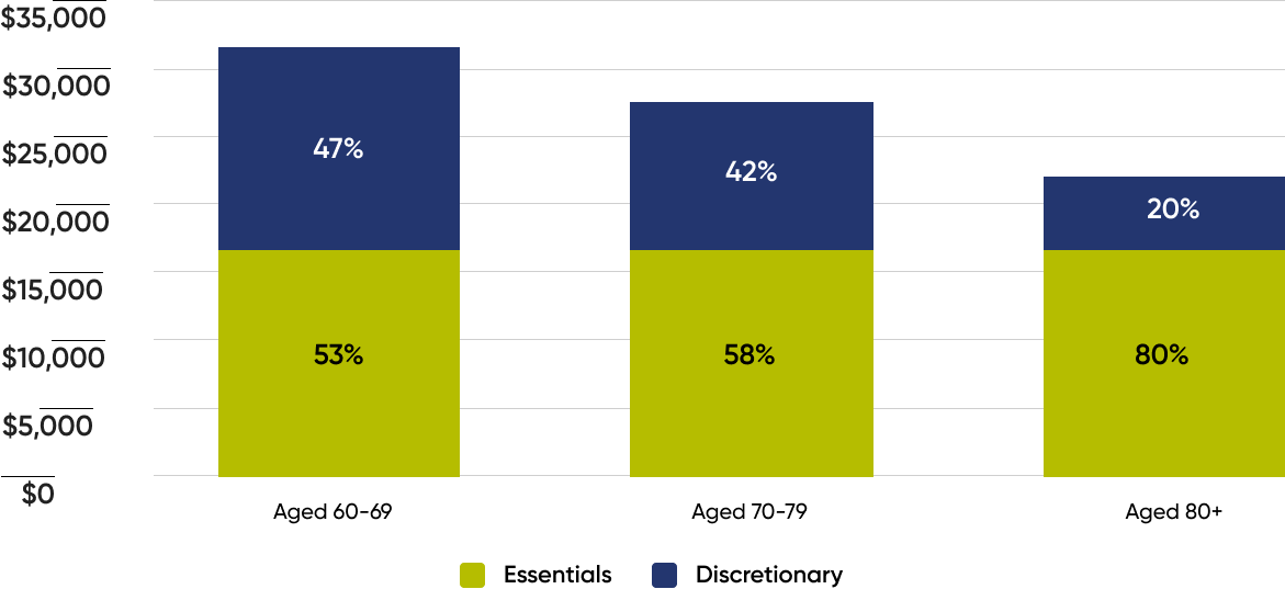 33. Challenger Retirement Illustrator (04/10/2022) using Social Security rates and thresholds effective 20 September 2022. 67 year old male/female client couple. $750,000 each in account-based pension. Assumes returns of 3.0% p.a. for defensive assets and 6.0% p.a. for growth assets before fees. $50,000 cash/TDs earning 3% p.a. interest. Non-financial assets of $20,000. $75,000 p.a. desired income including $50,000 p.a. essential income. Amounts shown are in today’s dollars. CPI of 2.5% p.a. See Challenger Retirement Illustrator for all assumptions. Reference number: RIC221004000264.