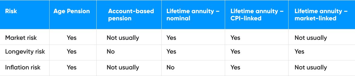 Table 2 below provides a useful comparison of how different product solutions can mitigate inflation risk, as well as market and longevity risk. (For the purposes of this paper, we are regarding the Age Pension as a product.)