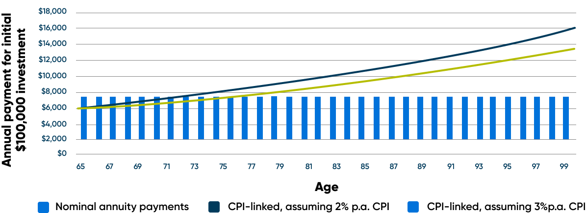 A variation on the ‘nominal’ lifetime annuity is the CPI-linked lifetime annuity. While initial payments under such an option are lower than those under the nominal annuity (reflecting the cost of providing that CPI protection), the heightened awareness of inflation risk, along with a medium-term expectation of elevated inflation, has increased the appeal of this particular option. As shown in Figure 13 below, even assuming a moderate inflation rate of 3%, the CPI-linked option will, over the longer term, deliver higher payments.