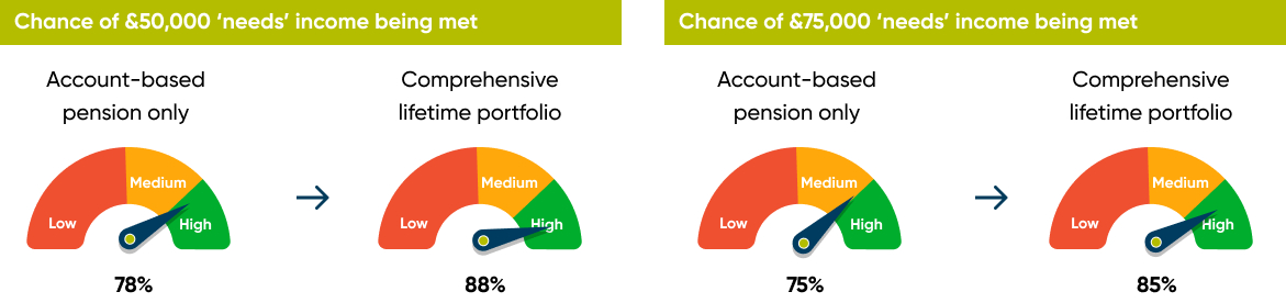 To demonstrate in practical terms the value of lifetime annuities as an inflation mitigant, we have illustrated below two example scenarios using CPI-linked lifetime annuities. Results are presented in terms of the likelihood of meeting different income thresholds for the duration of retirement and compare an ABP-only approach, versus a strategy using both an ABP and a lifetime annuity.
