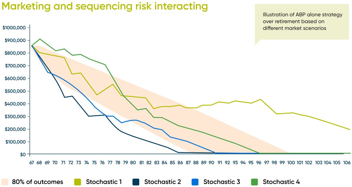As per the ’80% of outcomes’ shaded area, there is an 80% likelihood that the retiree’s entire savings will be exhausted between 20 and 33 years after commencement (at age 67). However, in some scenarios, such as ‘Stochastic 2’, these savings last as little as 18 years.