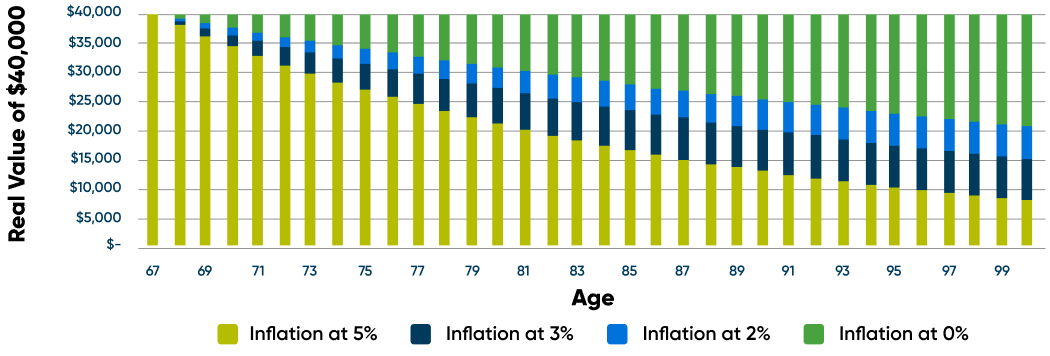 The impact of inflation on a retiree’s lifestyle can be dramatic. Without a wage or salary also increasing with inflation, retirees face additional risks to maintaining their lifestyle, as the purchasing power of their investments can erode. As can be seen in Figure 4, even modest rates of inflation can have a dramatic impact over a typical retirement horizon.