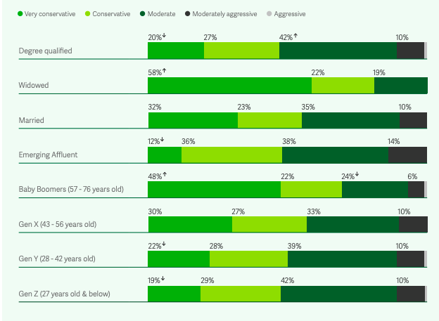 This conservatism does shift a bit for younger generations, with Gen Y and Z more likely to be moderate investors, (39 per cent and 42 per cent, respectively), as are those with a degree (42 per cent).