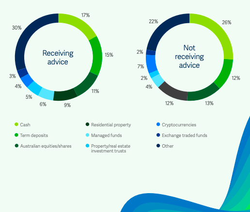 This skews their portfolio to asset classes such as Australian equities (17 per cent currently invest in them), term deposits (15 per cent) and residential property (14 per cent). A quarter of their portfolios are sitting in cash. Other asset classes they invest in less frequently include cryptocurrencies, managed funds, property/real estate trusts and ETFs.