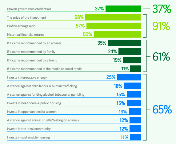It’s worth noting that many women do invest with an eye on environmental, social and governance (ESG) factors. Financial considerations are top – including the price of the investment (57 per cent), P/E ratios (57 per cent) and historic financial returns (50 per cent). However, ESG factors rank next in importance, with 37 per cent looking at proven governance credentials when investing. Also, 25 per cent said they would invest in renewable energy; 15 per cent would invest in healthcare & public housing; 15 per cent would look at a company’s stance against child labour & human trafficking; 15 per cent at their stance on funding alcohol, tobacco or gambling; and finally, 13 per cent would look at how the company invests in opportunities for women.