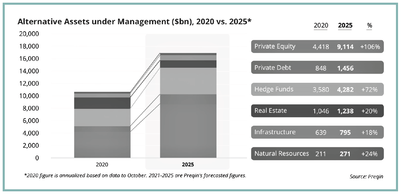 Alternative Assets already represent a significant market share of funds under management and research houses are expecting this asset class to experience unprecedented growth over the coming years.